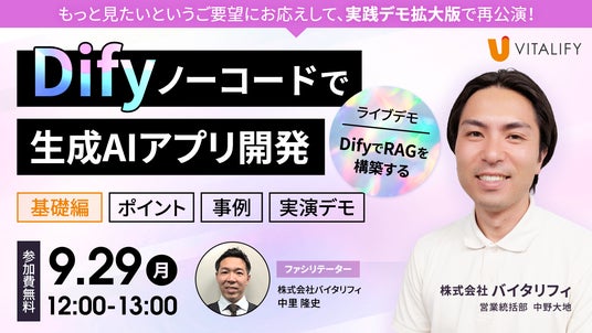 「ノーコードで利用できるDify」について詳しく学べる無料オンラインセミナーを開催いたします。もっと実演デモを見たいというお声を頂き、実演デモ拡大版となっております。生成AIの業務導入を成功に導くポイントや、実際に「Dify」を利用した生成AI活用などについて、実演デモをさらに増やして解説しますので、ご興味のある方はぜひ奮ってご参加ください。開催日時:9月29日(月)12:00~13:00