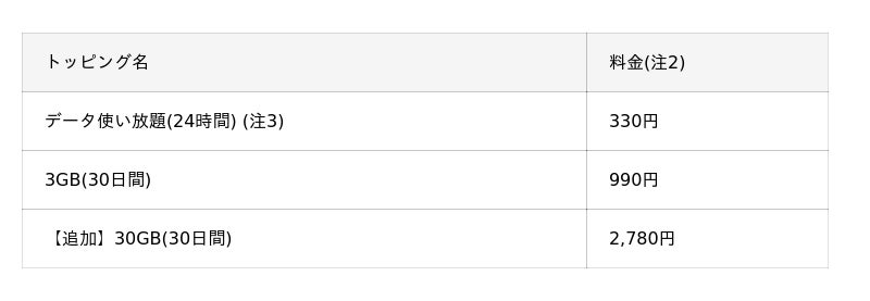 データ使い放題(24時間)、3GB(30日間)は、トッピング名および料金に変更はありません。