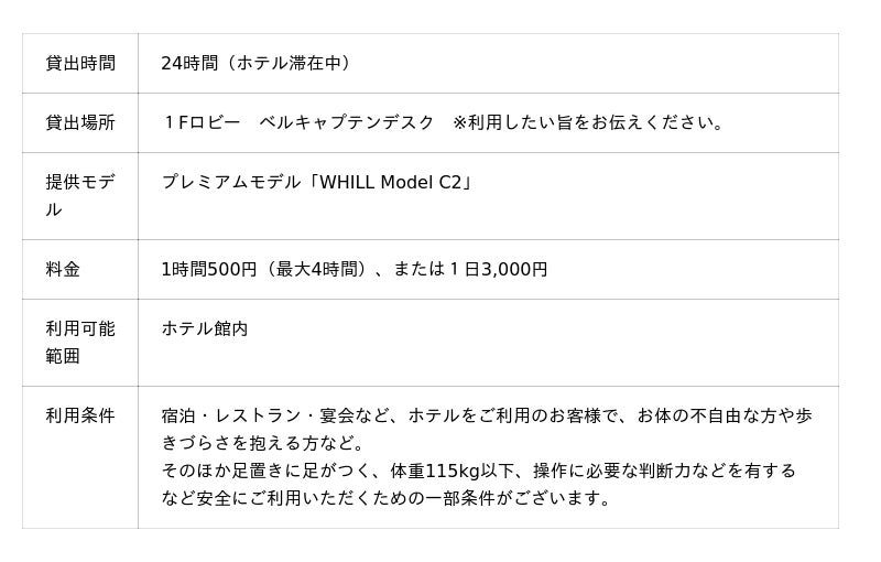 びわ湖大津プリンスホテル(所在:滋賀県大津市、総支配人:中山隆之)とWHILL株式会社(本社:東京都品川区、代表取締役社長 CEO:杉江理、以下「WHILL社」)は同ホテルにて免許不要で歩行領域を走行する近距離モビリティWHILL(ウィル)の移動サービスを導入することを発表いたします。高齢化や多様化に伴い、あらゆる人を迎え入れるための施設におけるアクセシビリティ機運が高まる中、広い館内を快適に移動する手段としてウィルを活用することで、体力や長距離歩行に不安を抱える方、ご家族3世代や訪日観光客など誰もが過ごしやすい環境を整えます。本取り組みは、株式会社西武・プリンスホテルズ&リゾーツが運営するホテルにおいてはグランドプリンスホテル広島に続いて2カ所目となります。