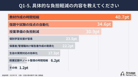 教材作成時間の短縮(40.7pt)、採点の自動化(34.6pt)、授業準備の負担削減(30.9pt)など、反復性・定型性の高い業務で特に効果が見られた。