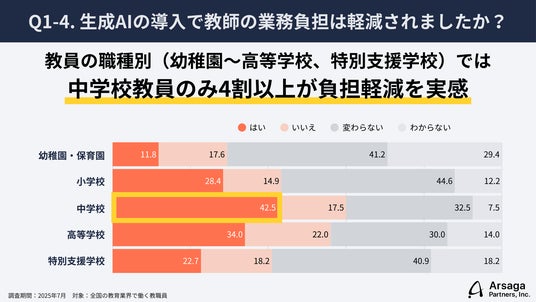 職種別でみると、中学校教員の約4割が負担軽減を実感。他職種では半数以上が効果を感じておらず、授業形式や課題内容との相性が影響している可能性がある。