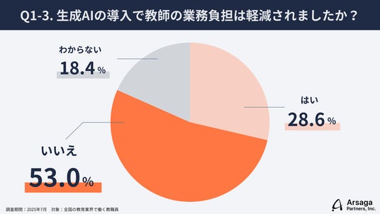 業務負担が軽減されたと答えた教職員は28.6%にとどまり、半数以上が「変わらない」「むしろ負担増」と回答。AI出力の確認や、生徒の成果物がAI利用かどうかの判別など、新たな管理業務が発生している現状が明らかになった。