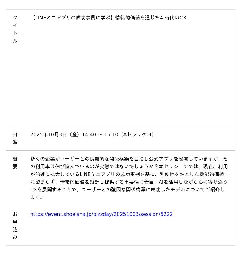 竹村が登壇するセッションでは、LINEヤフー株式会社(本社:東京都千代田区、代表取締役社長 CEO:出澤 剛、以下 LINEヤフー)のミニアプリ事業開発本部 本部長 谷口 友彦氏とともに、情緒的価値を通じたAI時代のCX(顧客体験価値)と、ユーザーとの強固な関係構築に成功した事例をお話しいたします。