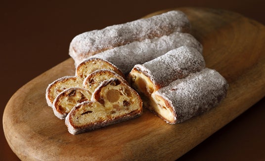 滑らかな「こしあん」、青ヶ島の“ひんぎゃの塩”をきかせた「黒蜜あんこ」、食感のアクセントとなる「くるみ」を包み込み、洋酒の代わりに黒蜜をたっぷりと染み込ませ、仕上げに上品な甘さの和三盆糖でコーティングした『新江戸シュトーレン』や、今年新作のドライフルーツが入り『新シュトーレン』も登場します。