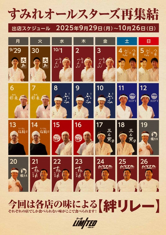 その第5弾として、今回は札幌の銘店「すみれ」に認められた11名の弟子たちが集結し、それぞれの店の味を2~3日ごとにリレー形式で披露する夢の競演「すみれオールスターズ」を開催いたします。開催期間は2025年9月29日(月)から10月26日(日)までの4週間限定です。