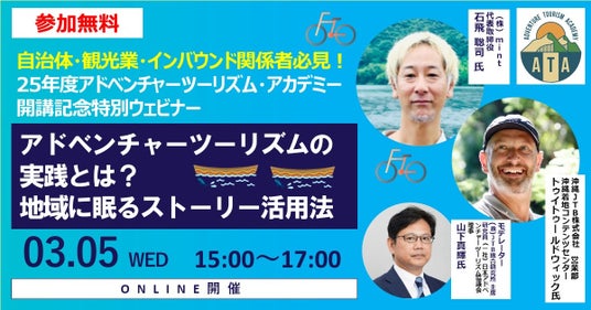 一般社団法人日本アドベンチャーツーリズム協議会(本社:東京都品川区、代表取締役:大西 雅之)は、株式会社JTB総合研究所と共催で、2025年度アドベンチャーツーリズム・アカデミーの開講記念ウェビナーを3月5日に開催します。広島の自転車ツアーと沖縄の伝統文化体験の事例を学びながら、地域資源を活かした観光コンテンツの作り方を実践的に学べる貴重な機会です。※株式会社JTB総合研究所が事務局運営を受託しています。