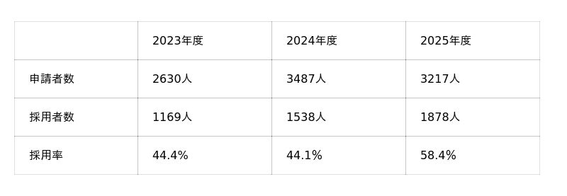 25年度の申請者は過去2番目に多い3217人で、依然として高い水準にあります。しかし、これまでの街頭募金をきっかけに多くの支援をいただけたおかげで、25年度は過去最多の1878人を奨学生として採用でき、採用率は14.3ポイント増の58.4%まで上昇しました。