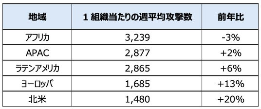 - アフリカでは、攻撃数の推移が前年比3%減にもかかわらず攻撃数は地域別で最も高く、1組織当たり週平均3,239件に上りました。