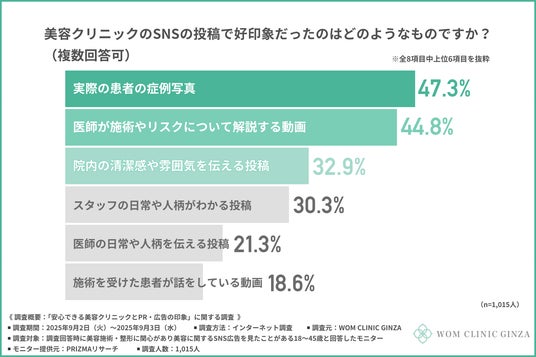 「美容クリニックのSNSの投稿で好印象だったもの」について尋ねたところ、『実際の患者の症例写真(47.3%)』『医師が施術やリスクについて解説する動画(44.8%)』『院内の清潔感や雰囲気を伝える投稿(32.9%)』が上位に挙がりました。