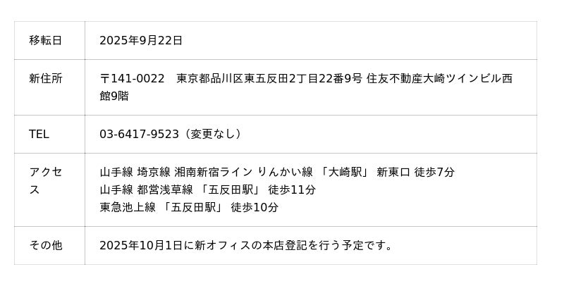 コンタクトセンター向けCXソリューションを開発・提供するモビルス株式会社(本社:東京都港区、代表取締役社長:石井智宏、以下 モビルス)は、より一層の顧客体験(CX)の提供をめざし、さらなる事業拡大と組織体制の強化を図るため、2025年9月22日(月)より本社を「住友不動産大崎ツインビル西館」へ移転することをお知らせいたします。