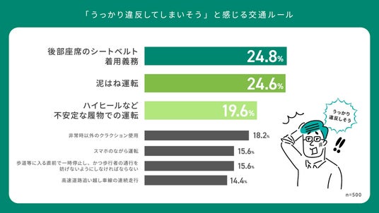 後部座席のシートベルト着用義務(24.8%)、泥はね運転(24.6%)、ハイヒールなど不安定な履物での運転(19.6%)がトップ3となった。
