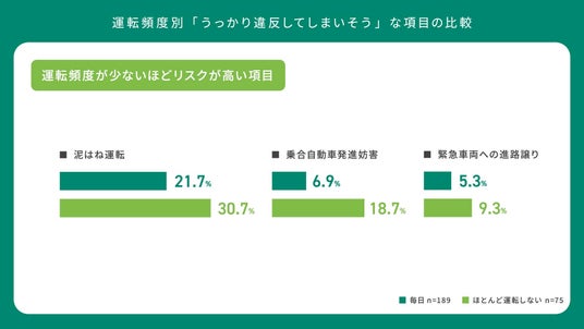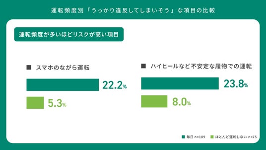一方、毎日運転する層では、「スマホのながら運転」や「ハイヒールなど不安定な履物での運転」などの「つい」やってしまいがちな「うっかり違反」リスクが高い傾向に見て取れました。