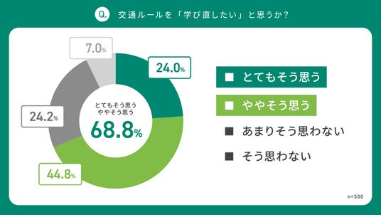 全体の68.8%が「交通ルールを改めて学び直したい」と回答。多くのドライバーが交通ルールの再確認の意向があることが判明した。