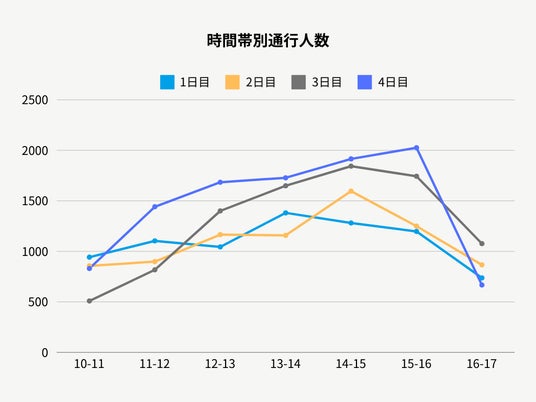会期4日間を通して、ブース正面、ブース側面の通行量を分析した結果、以下の傾向が見られました。