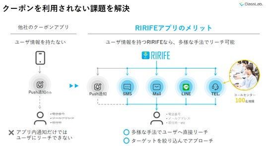 一方、RIRIFEアプリはユーザー情報を保有しているため、Push通知だけでなく、SMS・LINE・メールなど多様な手法でお客様に直接アプローチが可能です。