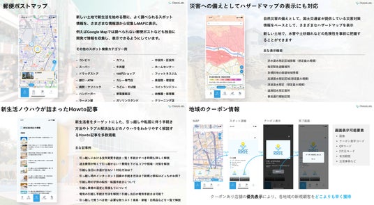 郵便ポスト・コンビニエンスストア・スーパーマーケット・銀行・病院・市役所など、新生活を始める際によく調べられる周辺スポットをマップに表示