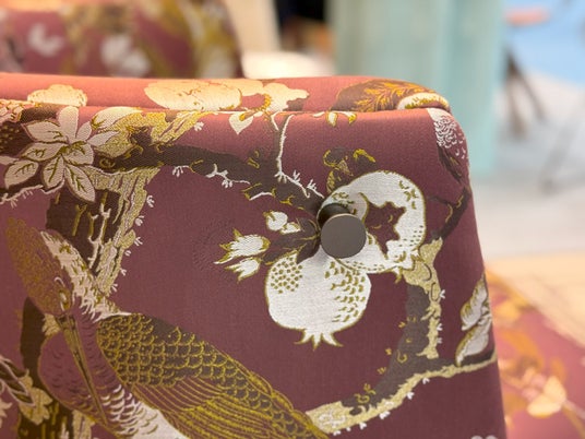 また、今回ご紹介する新製品の張り地は全て、現在ミラノで最も注目を集めるファブリックブランドDedar(デダール)を使用しており、この機会に是非Dedarのデザイン・クオリティも皆様へお伝え出来ればと考えております。今回の招待状のベース柄にもDedarの張り地"Scaramouche 004"を使用致しました。