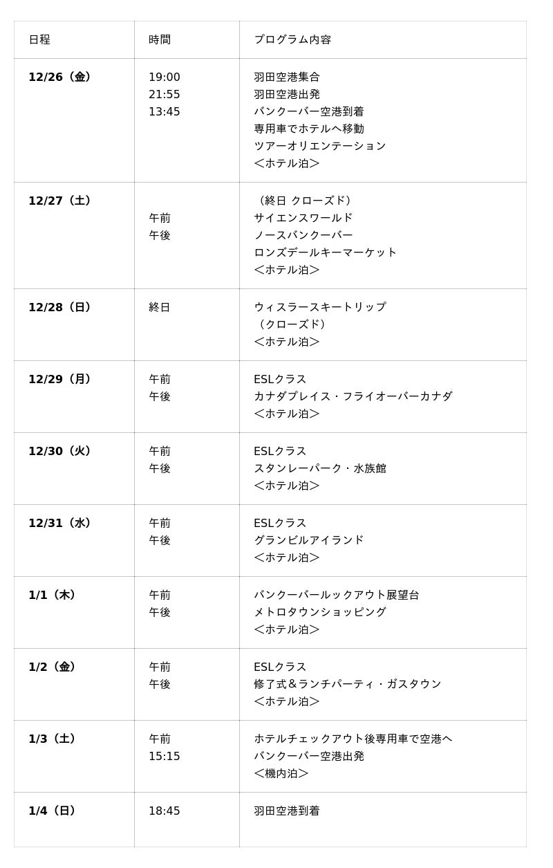 【日程】2025年12月26日(金)~2026年1月4日(日) 【対象】中学1年生~高校3年生 【開催地】カナダ 【申込締切】2025年10月21日(火)18:00