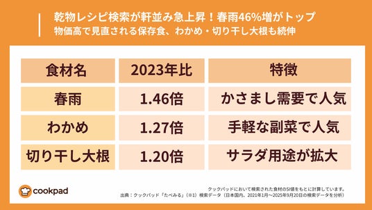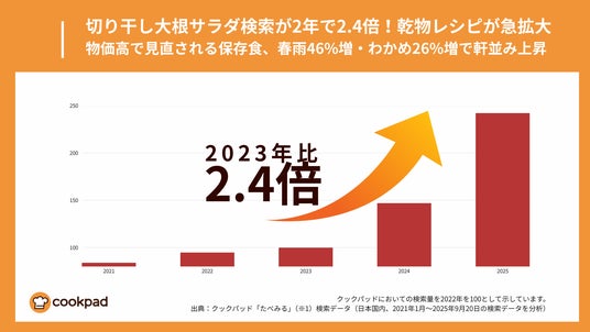 利用者数No.1レシピサービス「クックパッド」を運営するクックパッド株式会社は、乾物関連レシピの検索動向を「たべみる」(※1)で調査しました。調査の結果、「切り干し大根 サラダ」の組み合わせ検索が過去3年で約3倍に増加し、乾燥わかめも約1.8倍に増加していることが明らかになりました。物価高が続く中、価格が安定している乾物への関心が高まるのに加え、従来の「戻してから使う」調理法だけでなく「戻さずそのまま使う」調理法が広がり、時短・栄養・コスパを同時に実現する新たな食文化として定着し始めています。