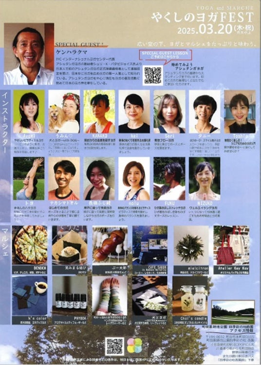IYCインターナショナルヨガセンター代表のケンハラクマ先生をお招きし、展望広場メインにて1時間のスペシャルレッスンを行います(参加費あり)。ケンハラクマ先生は、アシュタンガヨガの創始者シュリ・K・パタビジョイス氏より日本人で初のアシュタンガヨガ正式指導資格者として直接認定を受け、日本中にヨガを広めヨガの第一人者として知られています。現在はアシュタンガヨガを中心にヨガの普及活動に努めていて、日本のヨガ界をけん引しています。