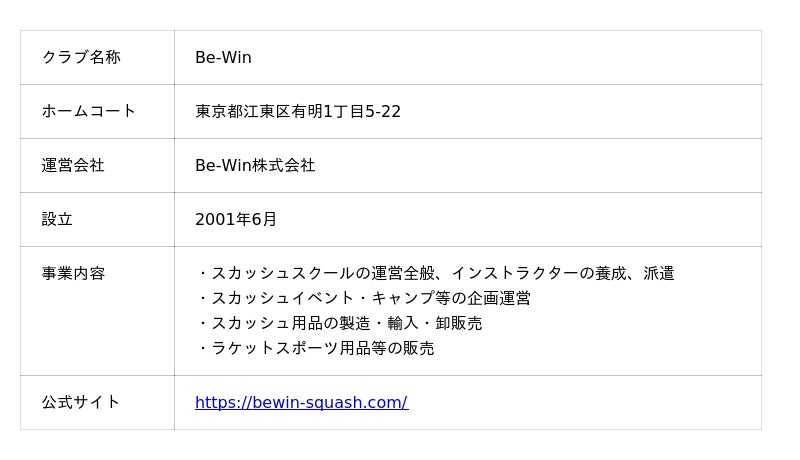 Be-WinについてBe-Win株式会社は、スクール事業をベースに選手の育成を行い、長きにわたり、日本スカッシュ界の土台形成ならびに競技力向上に取り組まれてきました。これまでにジュニアの国内トップクラス選手を多数輩出し、国際大会にも活動の幅を広げています。さらに、スカッシュの体験イベントや、教育現場と連携した授業への協力など、スカッシュを通じた社会貢献活動にも尽力されています。