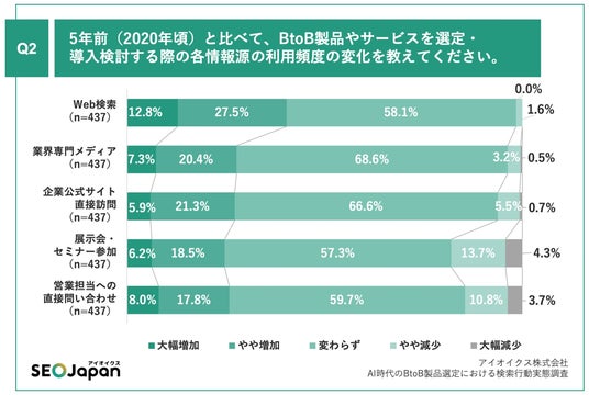 「Q2.5年前(2020年頃)と比べて、BtoB製品やサービスを選定・導入検討する際の各情報源の利用頻度の変化を教えてください。」(n=437)と質問したところ、「Web検索」は「増加」が40.3%、「営業担当への直接問い合わせ」は「増加」が25.8%という回答となりました。