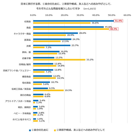 - 日本旅行中の買い物は「自分用」「家族や友人へのおみやげ」とも、化粧品と食品が人気