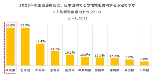 訪問予定の地域(都道府県)に関しては、「東京」が最も多く、56.0%(568人)で1位となりました。「東京」を選んだ理由(フリーアンサー)は、やはり「ショッピング」を挙げた人が多く、また「東京タワー」や「浅草寺」、「インスタ映えスポット」など、東京観光に期待する声もありました。そのほか、昨今の日本アニメの人気もあってか、「秋葉原」や「二次元」といったキーワードを挙げた回答も多くありました。