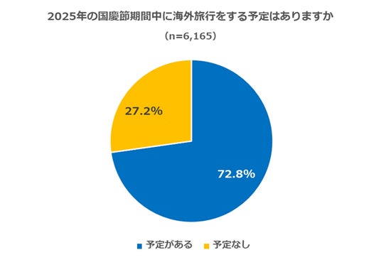 2025年の国慶節期間中(10月1日~10月8日)に海外旅行をする予定が「ある」と回答した人は、全体の7割以上となる72.8%(4,486人)でした。