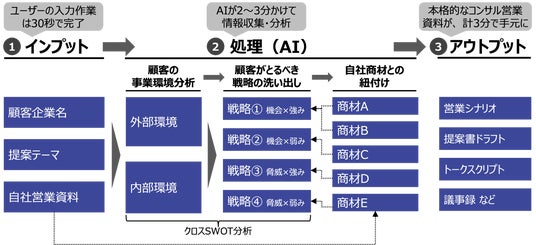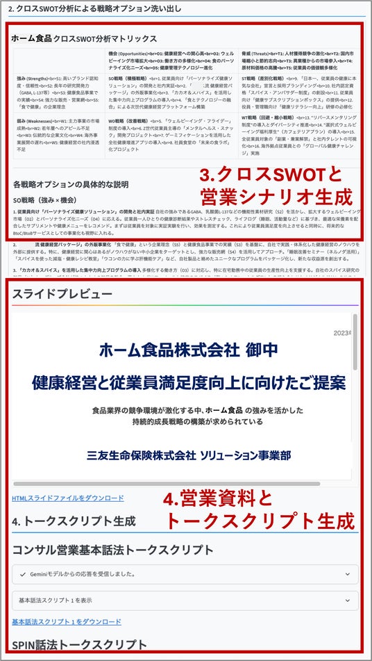 3.クロスSWOT分析を実施し、営業シナリオを生成. 4.コンサルティング営業資料とトークスクリプトを生成