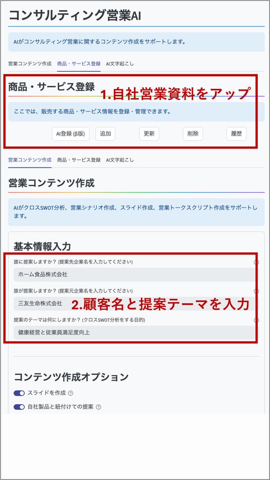 1.営業資料をアップロードすると、商材一覧が自動生成 2.提案したい顧客名と、提案テーマ(切り口)を入力