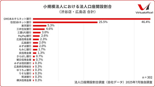 渋谷店では、ネット口座での法人口座開設割合が90.5%だった。最も口座開設割合が高かったのは、51.7%の「GMOあおぞらネット銀行」。次いで、「住信SBIネット銀行」が26.0%という結果だった。