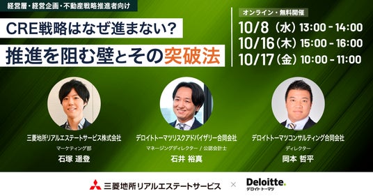 不動産総合コンサルティング会社の三菱地所リアルエステートサービス株式会社(本社:東京都千代田区)は経営層・経営企画・不動産戦略推進者向けに「CRE戦略はなぜ進まない?推進を阻む壁とその突破法」セミナーを10月8日(水)にオンラインで開催します。
