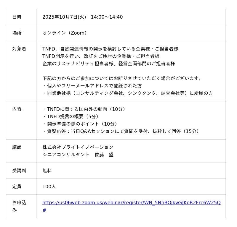 エンビプログループの株式会社ブライトイノベーション(本社:東京都中央区、代表取締役社長:荻巣 和紀)は、TNFDや自然関連情報の開示を検討している企業のご担当者様向けに、2025年のTNFD提言に沿った開示に関する国内外の動向や開示準備をする際のポイントについて、コンサルタントが詳しく解説するウェビナーを無料で開催します。