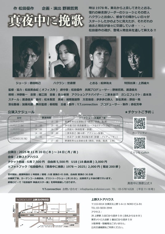 松田優作氏が作・演出を手掛けた最後の舞台『真夜中に挽歌』が、2025年11月20日(木)から11月24日(月・祝)に「上野ストアハウス」で再再演されることが決定いたしました。