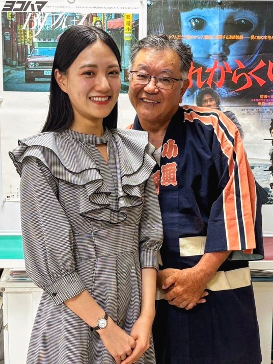 優作氏の主演ポスターを前に野瀬哲男と世森響