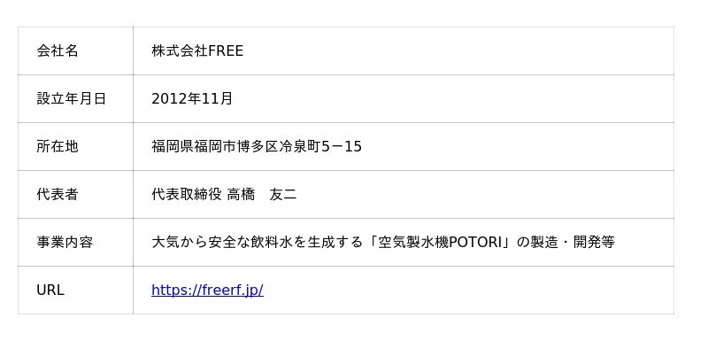 FREEは、大気中の水分を取り込み、ろ過・殺菌して安全な飲料水を生成する「空気製水機POTORI」を開発・提供しています。本製品は環境に優しく、災害時や水資源の乏しい地域でも安定的に利用できることが特長です。家庭用から業務用まで幅広いラインアップを展開し、持続的な水供給ソリューションの提供を目指しています。