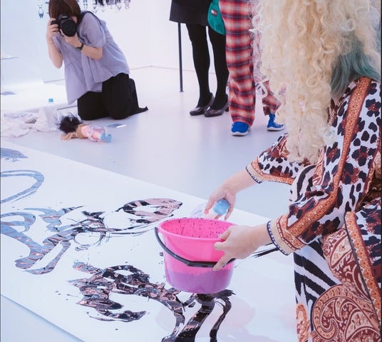 このたびの福岡巡回展では、作品鑑賞に加えて多彩な体験イベントを開催いたします。オープニングを飾る書道のライブパフォーマンスをはじめ、ヴィヴィアン佐藤自身によるヘッドドレス・ワークショップ、そして「オーラの似顔絵」など、表現と鑑賞を往還するユニークなプログラムを通じて、アートとの新しい出会いをお楽しみいただけます。