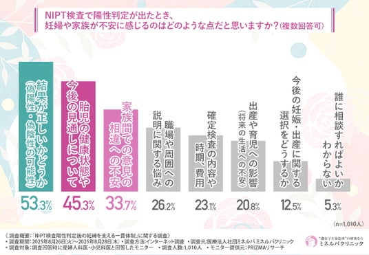 はじめに、「NIPT検査で陽性判定が出たとき、妊婦や家族が不安に感じるのはどのような点だと思うか」と尋ねたところ、『結果が正しいかどうか(偽陽性・偽陰性の可能性)(53.3%)』と回答した方が最も多く、『胎児の健康状態や今後の見通しについて(45.3%)』『家族間での意見の相違への不安(33.7%)』となりました。