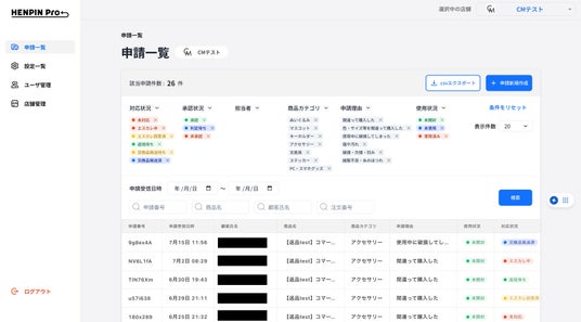 HENPIN Proを通した返品交換申請は、全てHENPIN Proのシステム管理画面に蓄積されます。