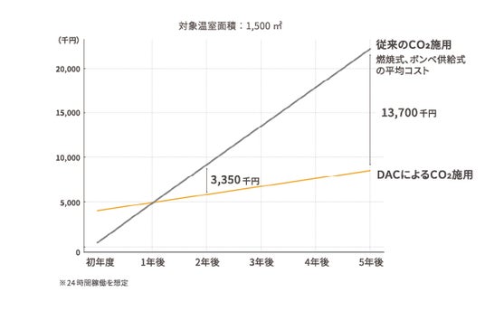 コスト比較従来のCO2施用(燃焼式やボンベ供給式)は、燃料費やガス供給コストがかさみ、年々負担が増大します。1,500平方メートルへ20kg/日のCO2を施用するケースでDACと従来方式を比較すると、DACは初期投資こそ大きいものの、運用コストが圧倒的に低いため、わずか1年で従来方式を逆転。5年間で約1,400万円のコスト削減効果を実現します。