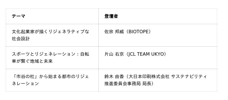 リジェネラティブな社会を実現する上で共催者が注目している要素である「政治」「環境」「人間性」「社会」「文化」「経済」の6分野から、企業、研究者、文化人、メディア、イノベーター、エコシステムビルダーなど多様な登壇者が集結します。食、文化、デザイン、スポーツ、企業経営、森林、地域といった幅広いテーマを横断し、多角的な視点から議論を深め、リジェネラティブな社会の実現に向けた道筋を探ります。