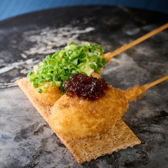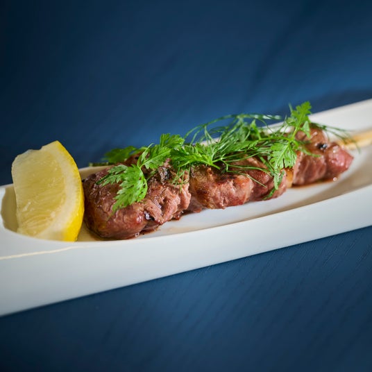英国産ラムのチャンブ アントリムド(ランプ)を串焼きで焼き鳥専門店らしく仕上げた一品。食べやすいラム串の上にはディルやパクチーなどのハーブがのり、ラム本来の味わい、うまみを炭火と香味野菜が引き立てます。【ディナー限定】