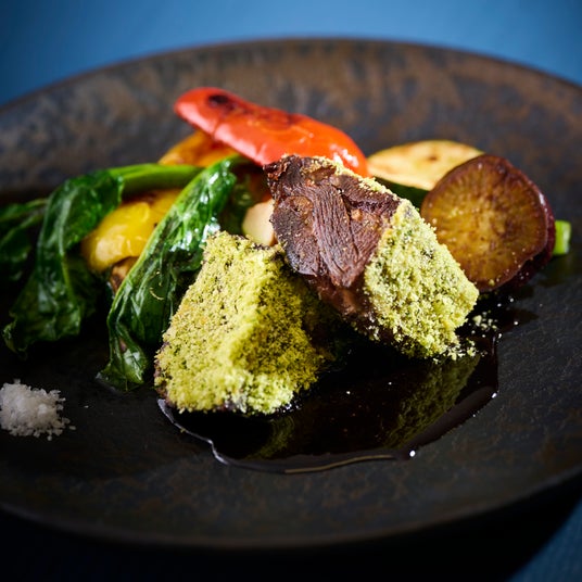 英国産ビーフのタンをフランス料理の技法、コンフィでナイフがいらないくらいまで柔らかく火を入れ、香草パン粉とフレンチマスタードをまとわせています。色とりどりの野菜と塩、クラシックな赤ワインソースで、ワインも進む一皿に。【ディナー限定】