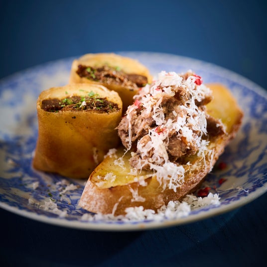 英国産ビーフのハラミを柔らかく煮込んで仕上げたリエットを春巻き仕立てに。バゲットには英国産ビーフのタンを使ったリエットをのせました。楽喜らしい和風の味付けで、英国産ビーフのうまみを感じられます。【ディナー限定】