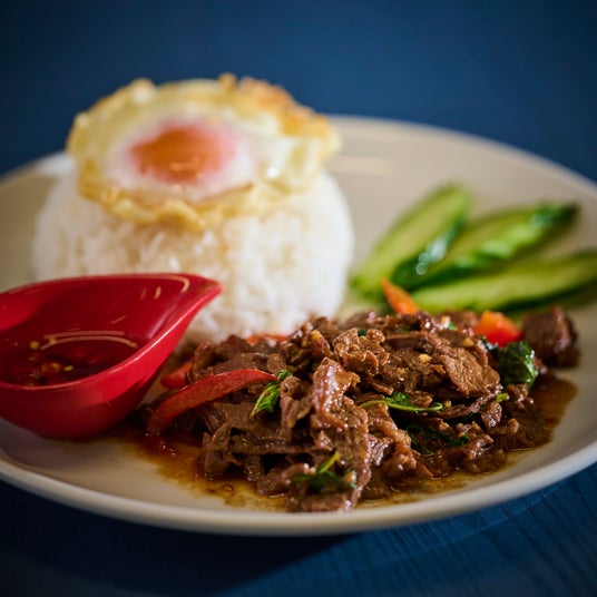 英国産ビーフのハラミとホーリーバジルを贅沢に使用した数量・期間限定のガパオライス。ガパオライスといえば鶏肉や豚肉がメジャーですが、本場ではビーフのガパオも親しまれています。牛ハラミとタイ米の相性もよくご飯が進む一品。【終日提供】