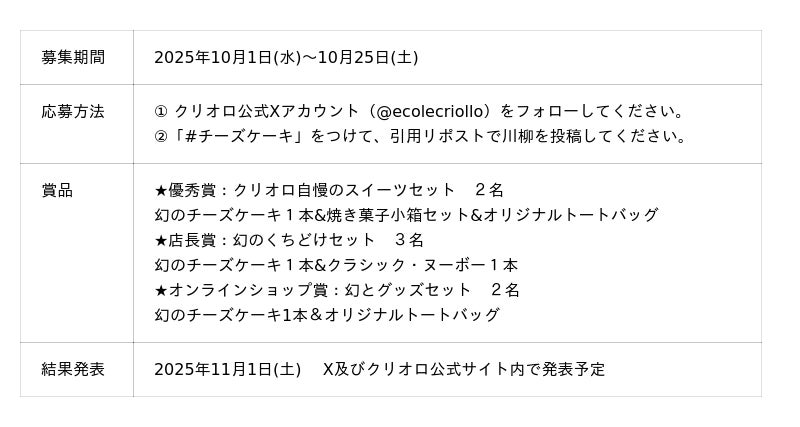 「幻のチーズケーキ」をお題に、20周年記念の川柳コンテストをX(旧Twitter)で開催いたします。