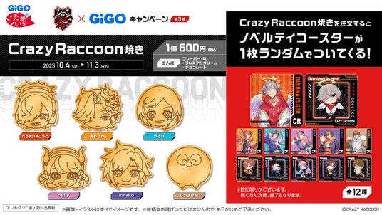 GiGOのたい焼きにて、「Crazy Raccoon」所属のストリーマー6名をモチーフにしたコラボたい焼き「Crazy Raccoon焼き」を販売いたします。「Crazy Raccoon焼き」ご購入1点につき、オリジナルコースター(全12種)をランダムで1枚進呈いたします。■商品名:Crazy Raccoon焼き 第3弾
