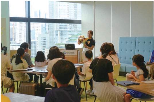 今回のワークショップは、「CurioStep with Sony」で提供される夏季特別企画「CurioStep サマーチャレンジ2025」の一環として開催し、18名の子どもたちが参加しました。講師としてお招きした日本サステナブルフラワー協会からは、「フラワーロス」や「地球温暖化」について、ソニー銀行からは、ソニー銀行の環境への取組について紹介しました。さらに、子どもたちが感じたことや、自宅でできることを考えてもらい、環境問題への理解を深める時間を設けました。