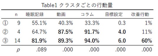 参加者のプログラム中の行動量に基づき、以下の3クラスタに分類しました。(Table1)非アクティブ群:行動量が低い
